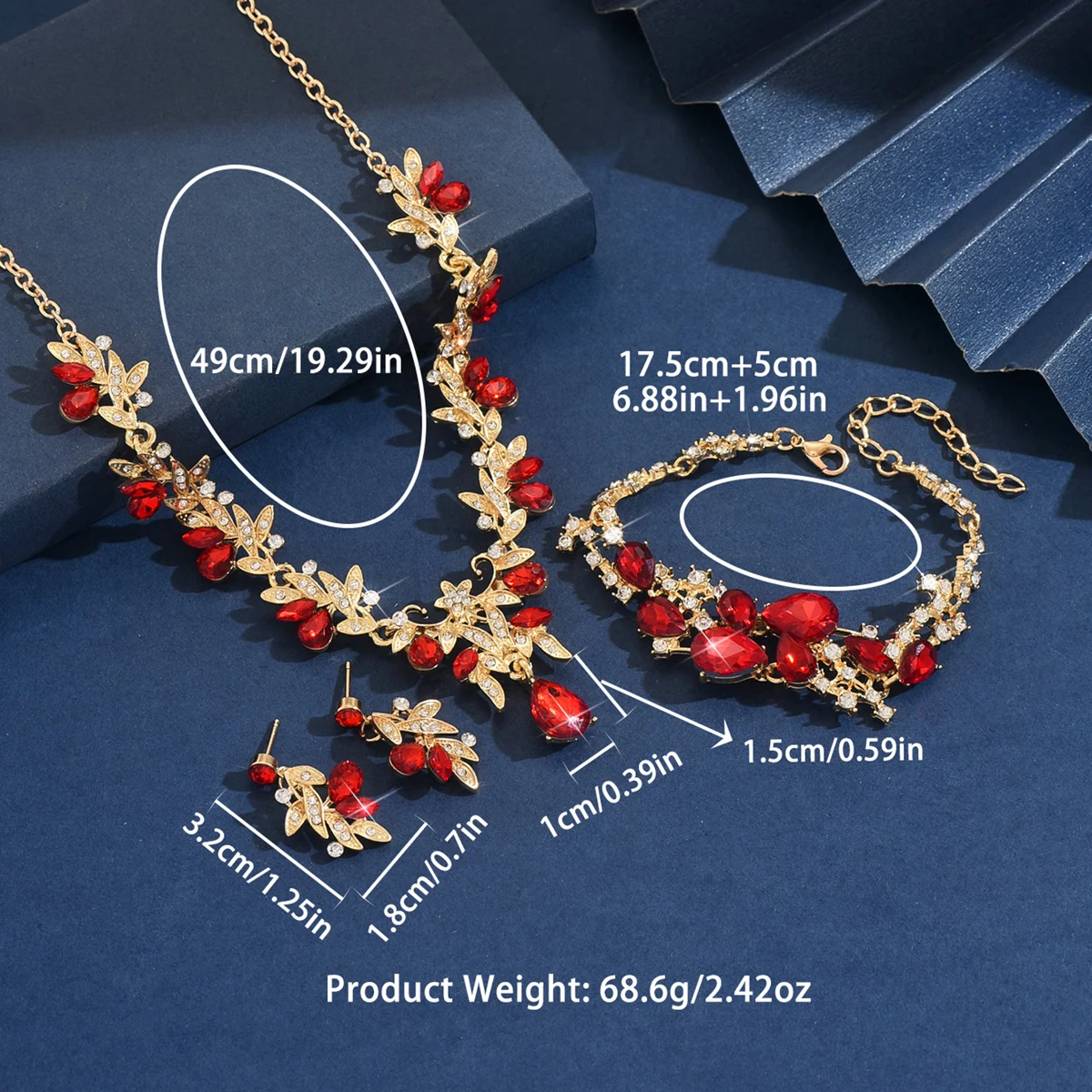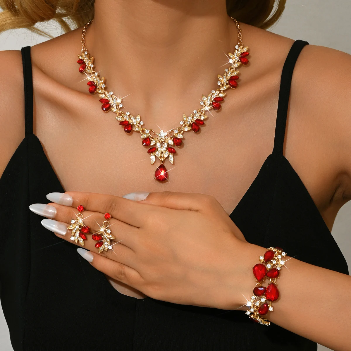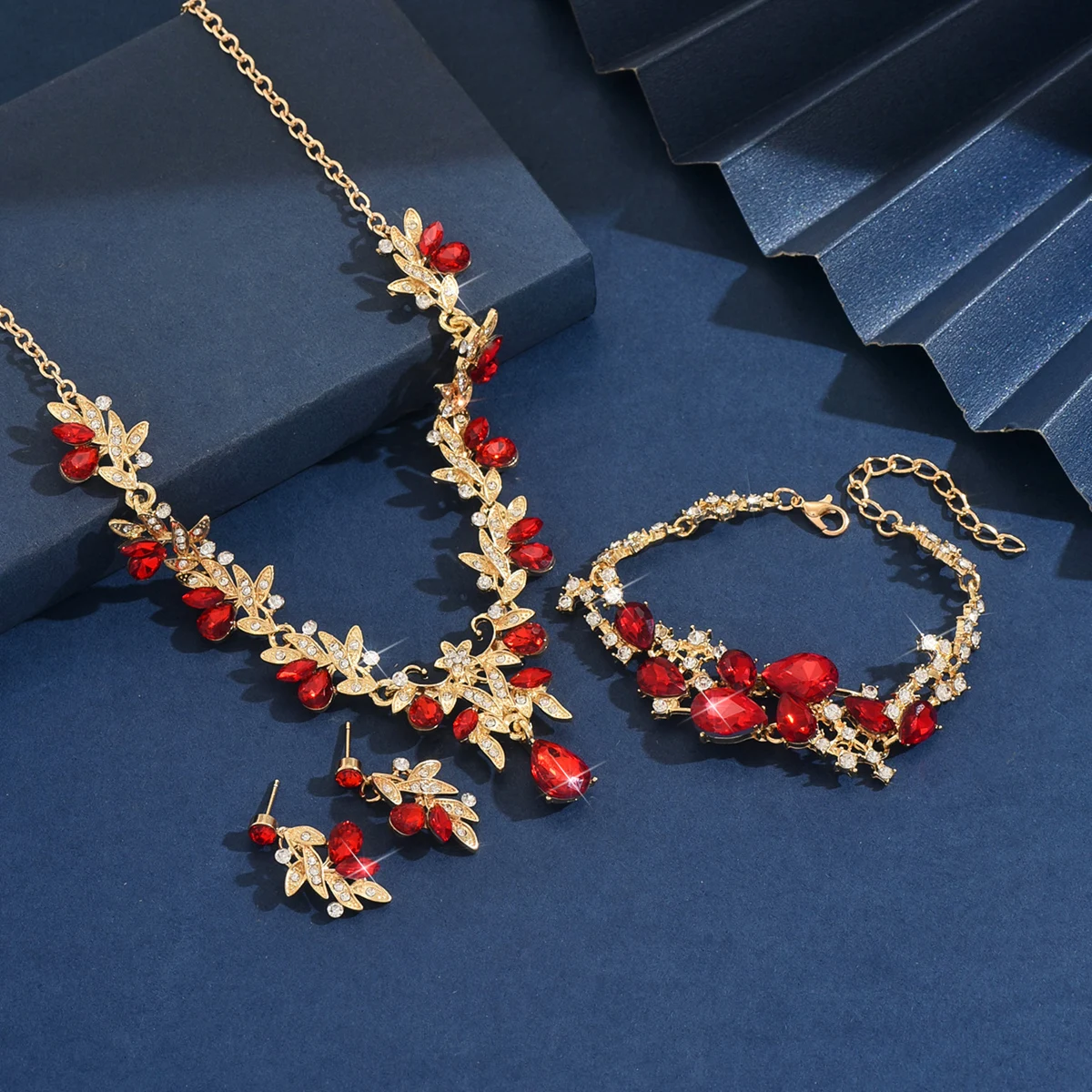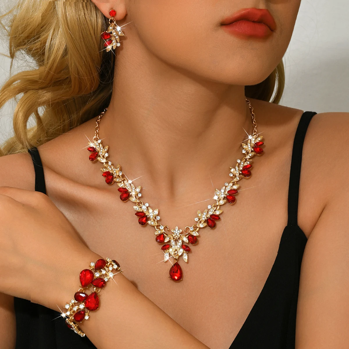 A set of fashionable and exquisite alloy diamond-encrusted, red crystal pendant necklace, earrings and bracelet, ladies' jewelry