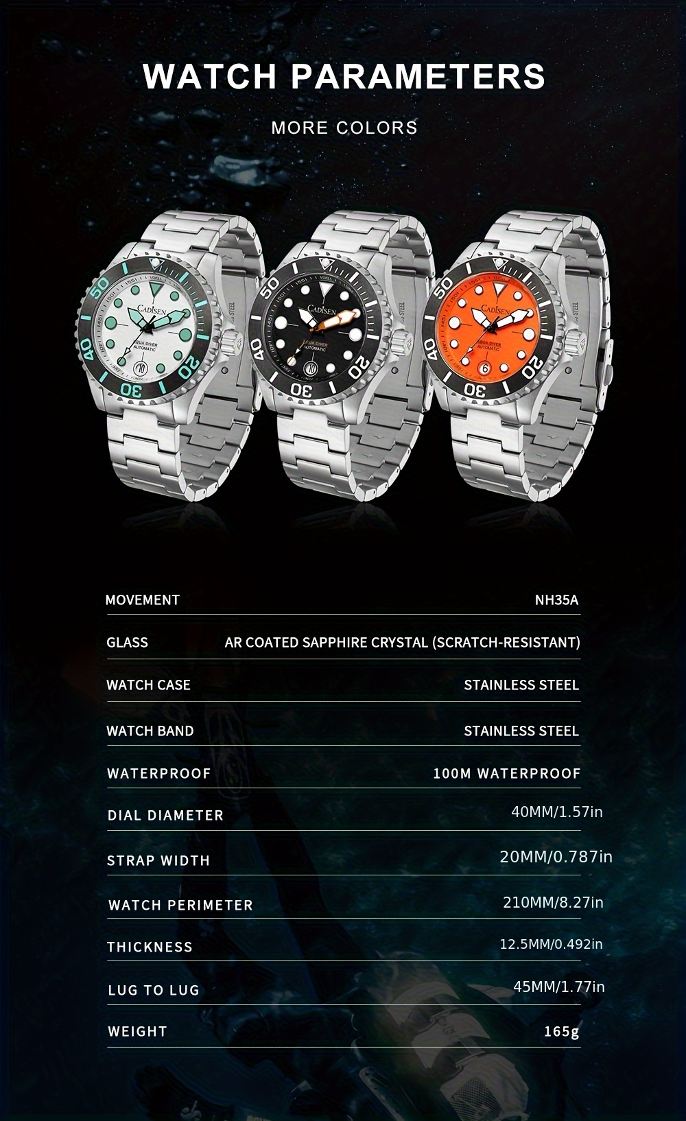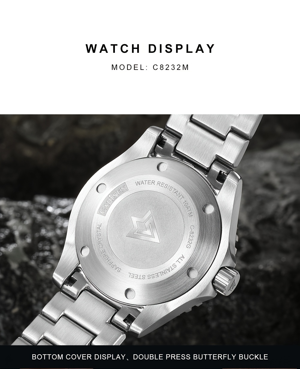 Brand: CADISEN Model: C8232M Style: casual, fashionable, sporty, business, luxurious Display: Pointer on a gauge Movement: Japanese NH35 movement Main feature - Completely new with tag and high quality - 10ATM / 100M Deep waterproof (Can support cold showers and swimming, do not operate the watch while underwater); - Premium brand luxury high-quality design dial, date display function; Case material: 316L stainless steel Quality stainless steel strap
