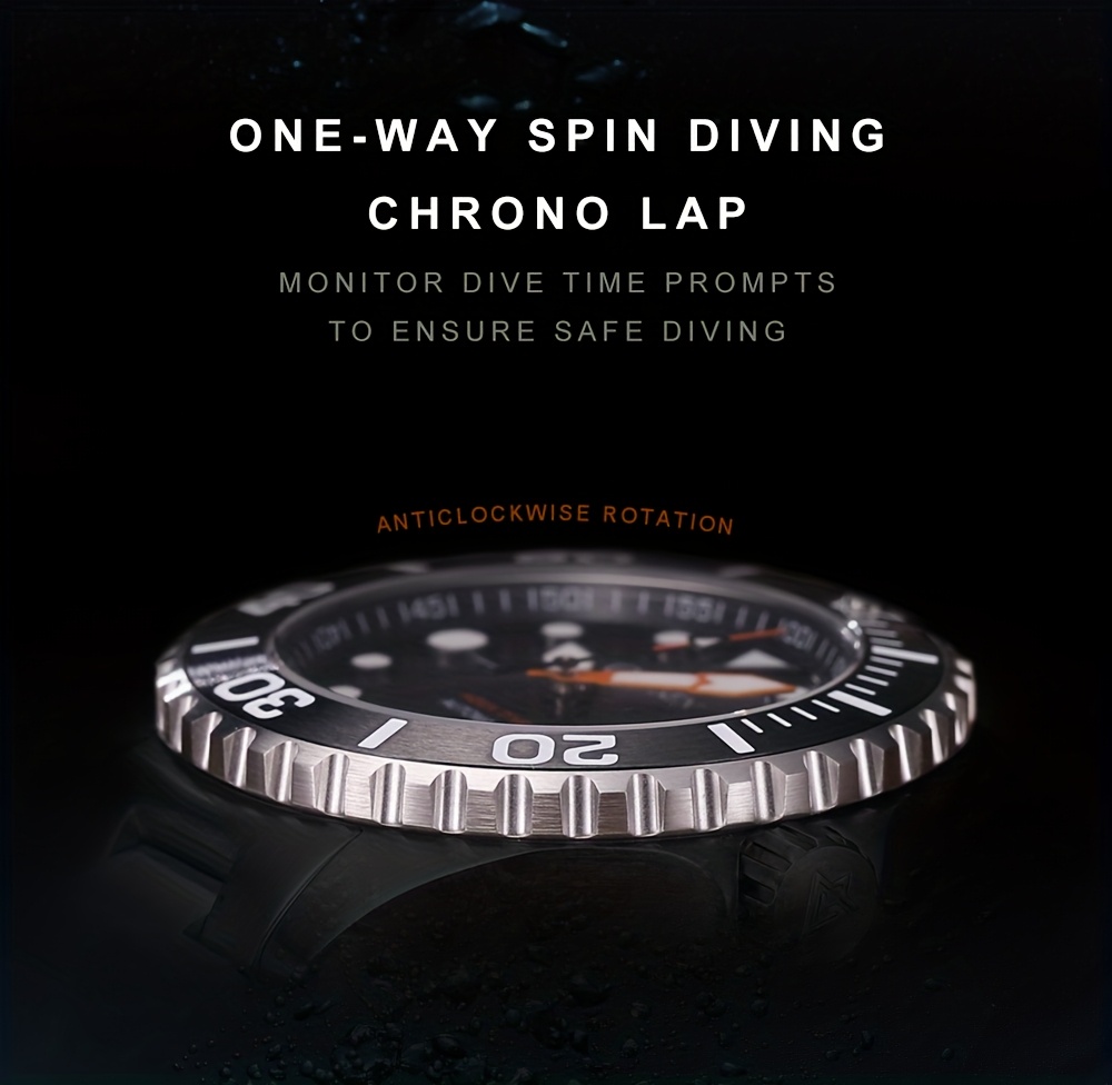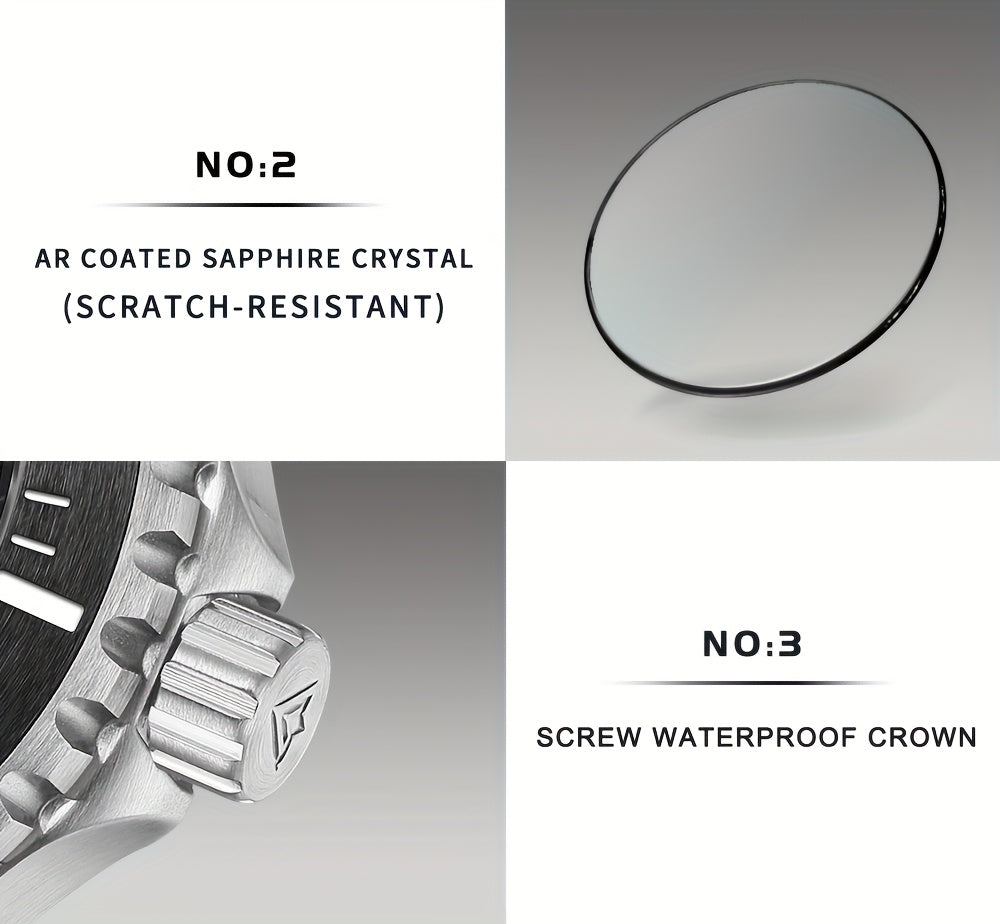 • Self-Winding Mechanism: Enjoy the luxury of a Japan NH35 self-winding mechanical watch, which guarantees precise timekeeping without the hassle of regular manual winding. • 10Bar Water Resistance: Tailored for thrill-seekers, this timepiece offers remarkable 10bar water resistance, ideal for diving and various aquatic activities. • Glowing Hands: Ensure you can always check the time in dim lighting with the practical glowing hands feature, which improves visibility and adds functionality.